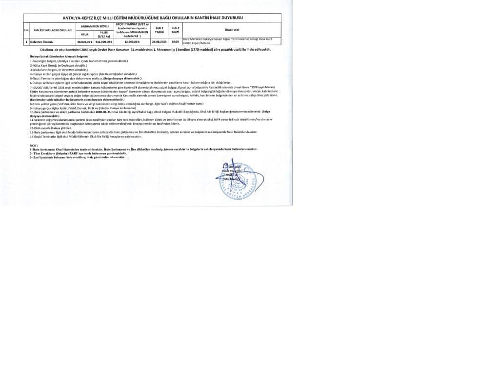 Okulumuz Kantin İhalesi 29/08/2025 tarihinde saat 10.00'da Kepez ilçe Milli Eğitim Müdürlüğünde gerçekleştirilecektir.